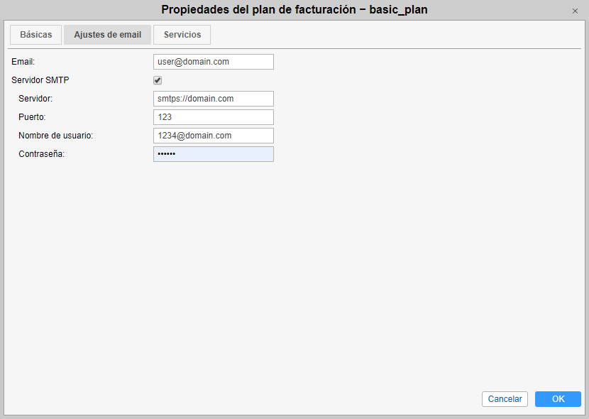 Puede enviar los mensajes del sistema utilizando un servidor SMTP de usted. Para ajustarlo, ingrese la dirección de correo electrónico y active la opción del servidor SMTP. A continuación, rellene los campos Servidor, Puerto, Nombre de usuario y Contraseña. Asegúrese de que en la dirección del servidor está indicado el protocolo: smtp o smtps.