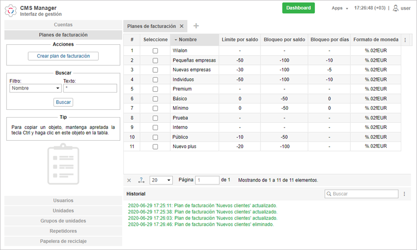 Para gestionar planes de facturación, abra la sección Planes de facturación en el Panel de navegación en CMS Manager. Solo aquí puede crear nuevos planes, así como ver, modificar y eliminar los que ya existen.