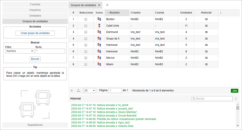 En el panel está ubicado el botón Crear grupo de unidades y el filtro de búsqueda. En la tabla de resultados a la derecha se muestra el nombre del grupo, el icono atribuido, el creador, la cuenta, la cantidad de unidades y el icono para abrir el historial. Véase sobre el proceso de crear, modificar y eliminar objetos en la interfaz de gestión en la sección Operaciones estandarizadas.
