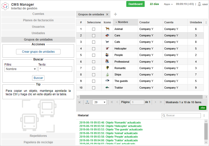 El panel de resultados es la parte central más grande. Aquí se puede manejar varios objetos del sistema (ver, modificar, eliminar, distribuir derechos de acceso, etc.).