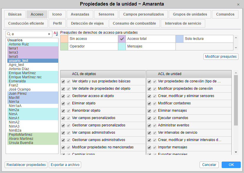 A la izquierda se muestra la lista de usuarios cuyos accesos puede administrar usted. Los nombres de los usuarios que tienen algún acceso a la unidad tienen el fondo de color.