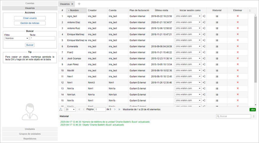 Los usuarios como objetos del sistema tienen una aplicación específica en la interfaz principal de Wialon, que está descrito abajo (enviar SMS, controlar la actividad del usuario, etc.).