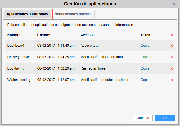 En esta pestaña se muestra la lista de aplicaciones que tienen algún acceso a los datos de su cuenta. Para cada aplicación se muestra la siguiente información: el nombre de la aplicación, la fecha y la hora de la creación del token y los derechos de acceso que tienen la aplicación a su cuenta. Para copiar un token, apriete Copiar en la línea de la aplicación necesaria. Se guardará en el búfer. Para prohibir el acceso de una aplicación a los datos, hay que eliminarla de la lista por medio del botón