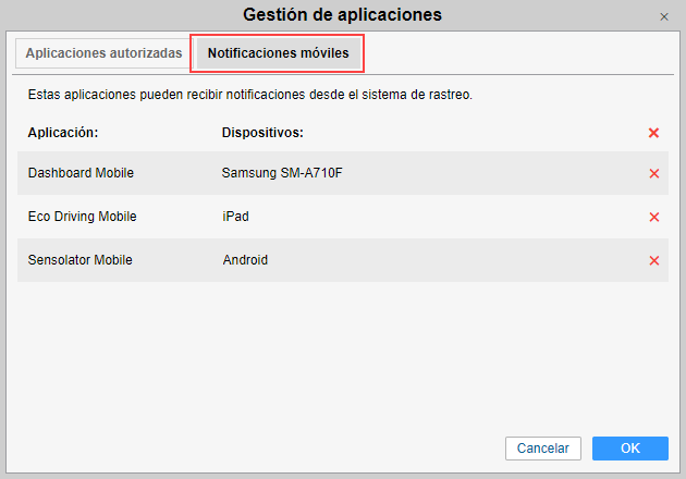 En esta pestaña está la lista de las aplicaciones que pueden enviar notificaciones a sus dispositivos móviles. A la izquierda está el nombre de la aplicación y a la derecha — la lista de dispositivos. Para prohibir que una aplicación envíe notificaciones móviles, hay que eliminarla de la lista (cruz roja al final de la línea).