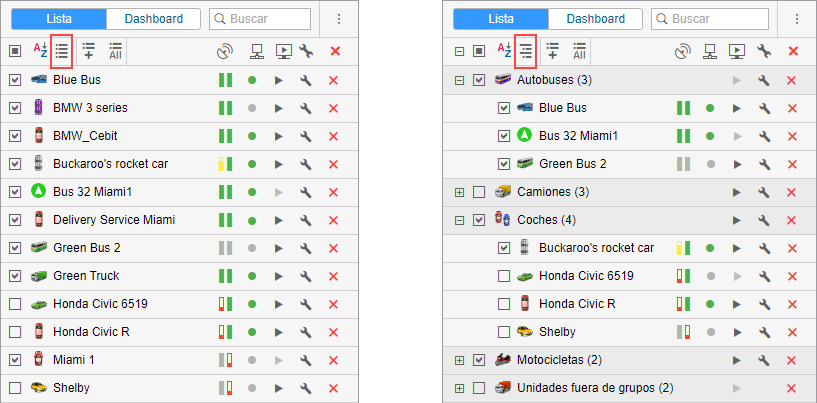 Para plegar/desplegar un grupo, es decir, plegar/desplegar la lista de sus unidades, utilice el botón más/menos en la primera columna de la lista. Para que las unidades de un grupo se muestren en el mapa, active el visto de este grupo. Para que se muestre una unidad determinada, despliegue el grupo y active el visto de esta unidad.