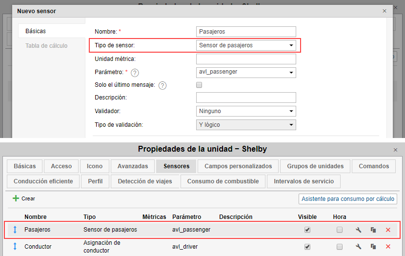 1. Hay que crear un sensor del tipo Sensor de pasajeros para todas las unidades a que se planifica asignar pasajeros. El parámetro de este sensor depende del tipo y la configuración del dispositivo utilizado.