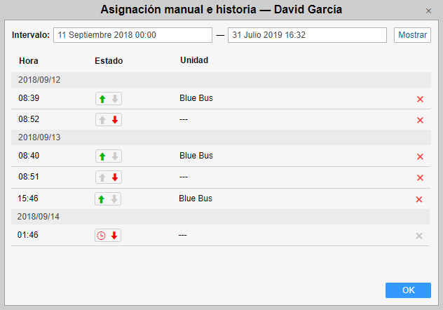 Se puede cambiar el estado del pasajero (a excepción del estado Bajada automatíca) manualmente por medio de hacer clic en el indicador necesario. Para eliminar un mensaje de la historia apriete la cruz roja al final de la fila correspondiente.