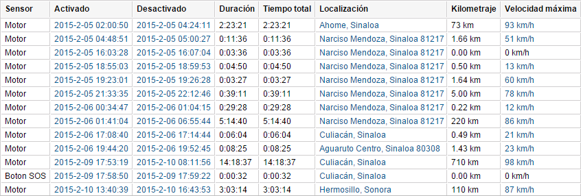 Localización — la ubicación de la unidad en el momento de activación del sensor.