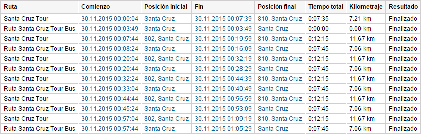 Si una unidad ha pasado por unas rutas, a su base se puede generar el informe correspondiente. Éste puede incluir las siguientes columnas: