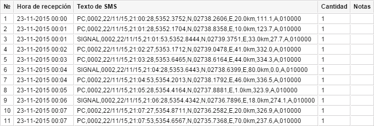 En este informe se puede revisar todos los mensajes SMS recibidos de una unidad en el intervalo temporal indicado. La tabla puede incluir las siguientes columnas: