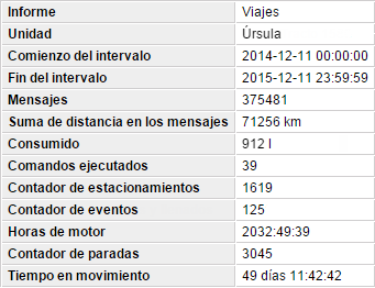 La tabla de las estadísticas ofrece la información resultante por el informe en general, como, por ejemplo, el tiempo del inicio y del fin del intervalo contable, la cantidad de mensajes, el nombre de la unidad, la zona horaria, la hora de generarse el informe y otros datos estadísticos de acuerdo con la tipo de plantilla de informe elegida.