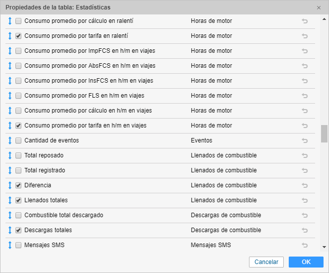 Consumo promedio por… en h/m — el consumo promedio de combustible determinado según las indicaciones de un sensor de combustible, por cálculo o tarifa.