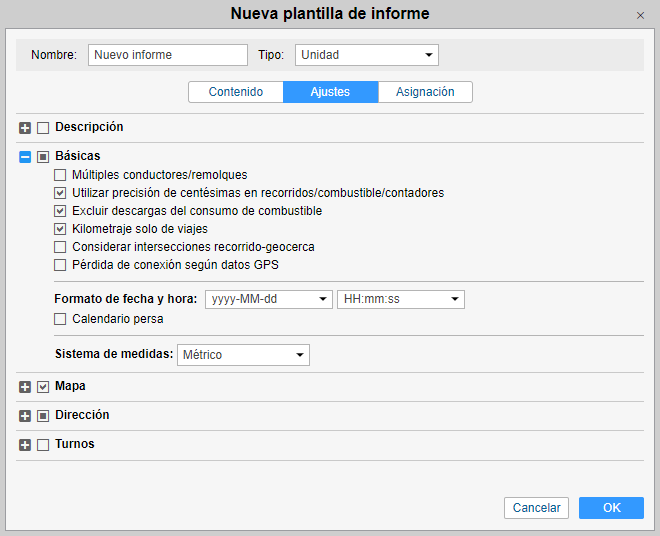 De acuerdo con el tipo del informe, la pestaña Ajustes puede contener hasta 4 secciones: