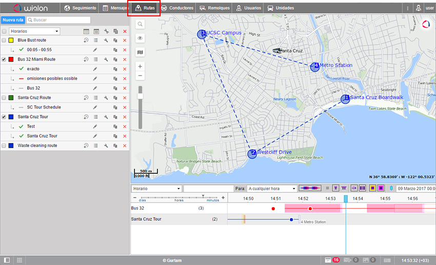 Wialon permite seguir las unidades que van por una ruta con varios puntos de control que tienen que visitar en una consecuencia dada o libre, según un horario o sin él.
