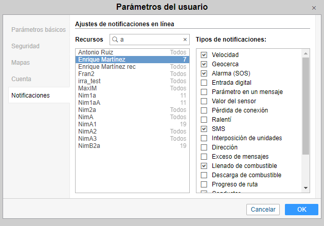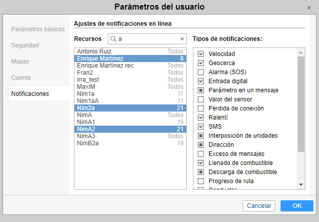 En la pestaña hay dos listas. A la izquierda se selecciona los recursos y a la derecha — los tipos de notificaciones.