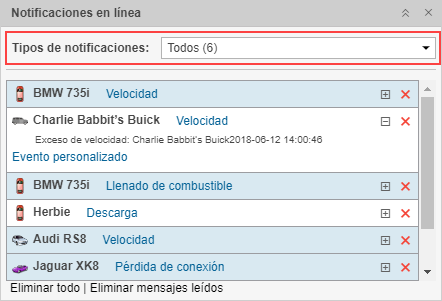 Para los usuarios del nivel superior y los usuarios con los derechos de distribuidor en la ventana emergente de notificaciones en línea está disponible el filtro por el tipo de notificación.