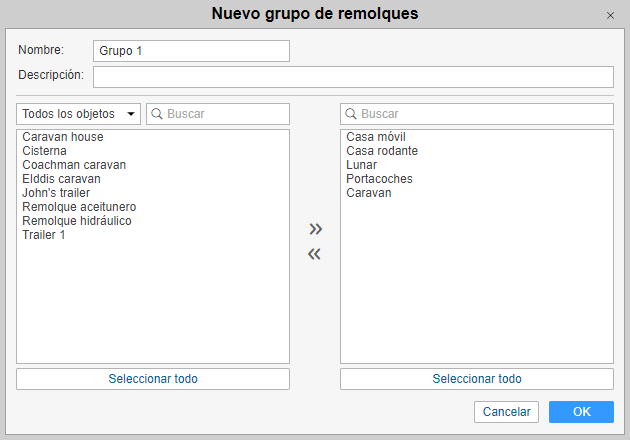 Para crear un grupo, apriete el botón Crear. Introduzca el nombre y la descripción del grupo. Los remolques que deben formarlo se escogen en la lista de la izquierda. El contenido de esta lista puede cambiarse por medio de escoger usted en el filtro situado sobre la misma una de las variantes disponibles: todos los objetos, un grupo de objetos (los nombres de los grupos disponibles se muestran entre corchetes) u objetos fuera de grupos. Mueve los remolques necesarios a la lista de la derecha (por doble clics o utilizando el botón Agregar). Apriete OK.