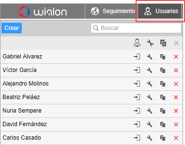 En el panel hay un botón Crear, un filtro dinámico y la lista de usuarios disponibles al usuario actual. Si es necesario, se puede usar el filtro dinámico para la búsqueda rápida del usuario necesario. Utilice iconos para realizar varias operaciones con los usuarios: